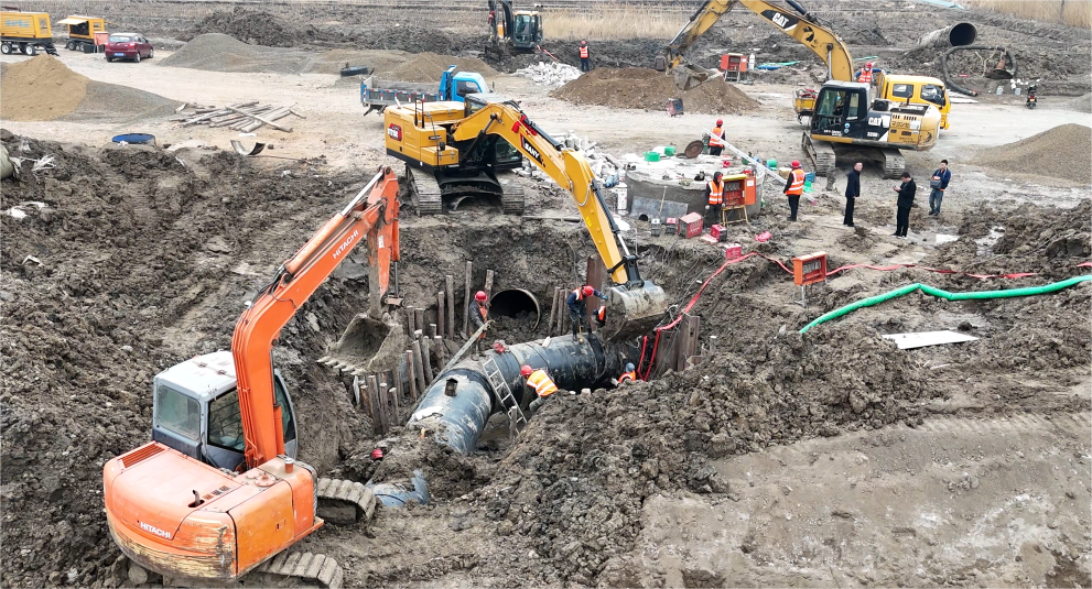 3月26日清晨6點,維修作業(yè)準時拉開帷幕。此次作業(yè)面臨著不小的挑戰(zhàn),待遷移的DN1400管線口徑大,且由玻璃鋼管與螺紋鋼管兩種不同材質管材連接而成,這無疑增加了施工難度。尤其是在轉換件連接環(huán)節(jié),對口精確度的要求近乎苛刻,稍有偏差就可能導致膠圈翻折,影響供水安全。面對這一難題,經(jīng)驗豐富的作業(yè)人員憑借精湛的技藝和高度的專注,嚴格把控每一個施工細節(jié)。